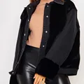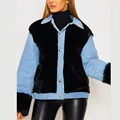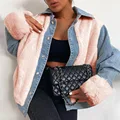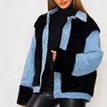 2021 Women Jackets Warm Faux Fur Coats Denim Patchwork Jacket Casual Loose Turn Down Collar Furry Coat Streetwear Autumn Winter